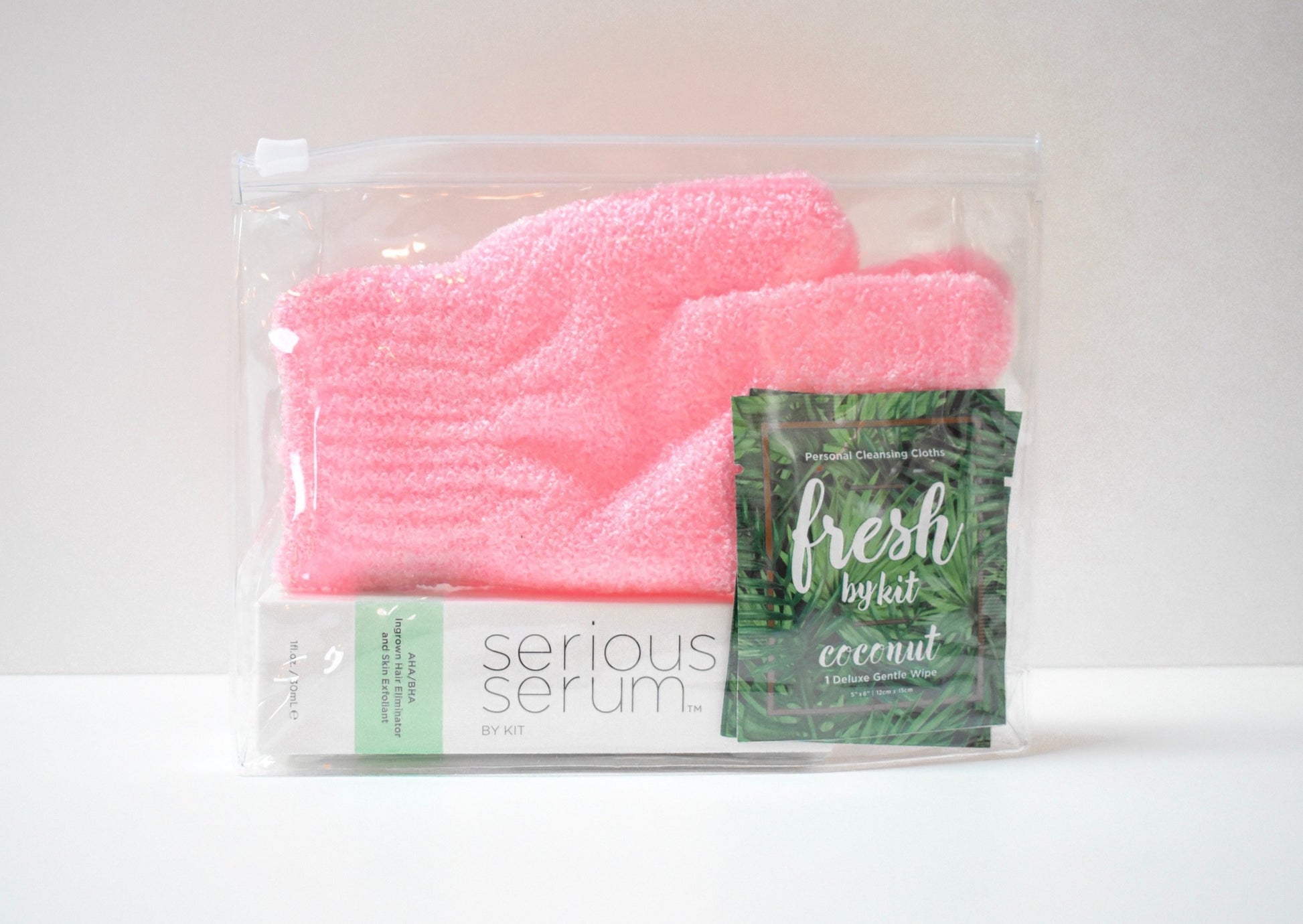Each kit contains 1 full size bottle of Serious Serum, 2 individually wrapped Fresh wipes intimate freshening wipes, and 1 set of washable exfoliating gloves*.